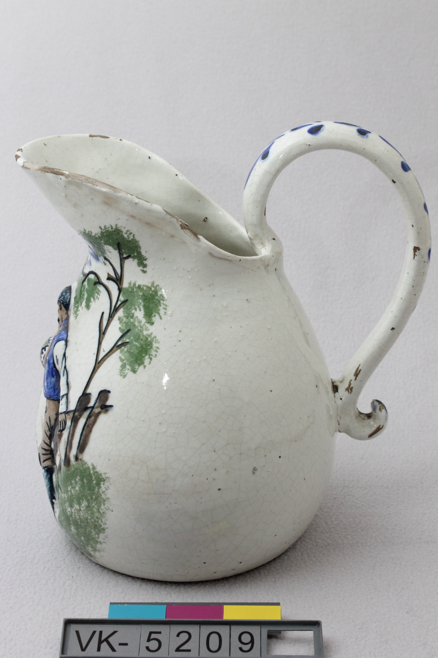 Weiß glasierter bauchiger Krug mit geschwungenem randständigem Henkel; die Verzierung ist teilweise als Halbrelief ausgeführt: Liebespärchen am Zaun, mehrfärbig bemalt.