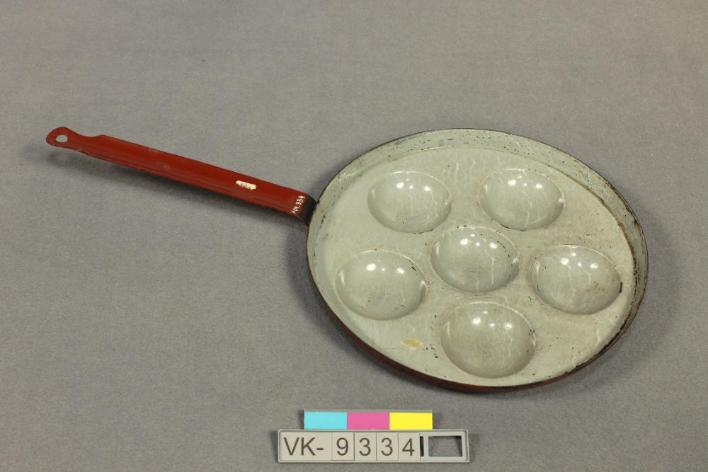 Flache Dalkenpfanne, innen grau und außen weinrot emailliert, mit sechs halbkugelförmigen Vertiefungen.