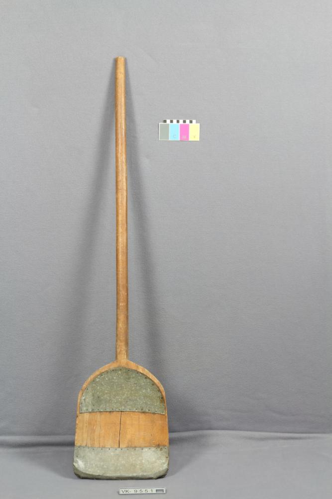 Flache Holzschaufel, aus einem Stück gearbeitet, auf dem Blatt mit verzinktem Blech verstärkt.