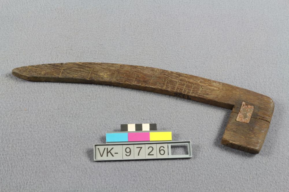 Binderwinkel: Holzbrettchen mit Krümmung, Griffbereich und einer eingeschnittenen Skala. Am Winkel ist eine Reparaturstelle mit Blech.