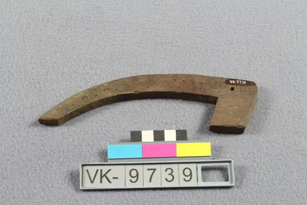 Binderwinkel: Holzbrettchen mit Krümmung, Griffbereich und einer eingeschnittenen Skala. Beschriftungen: "1885", "15".