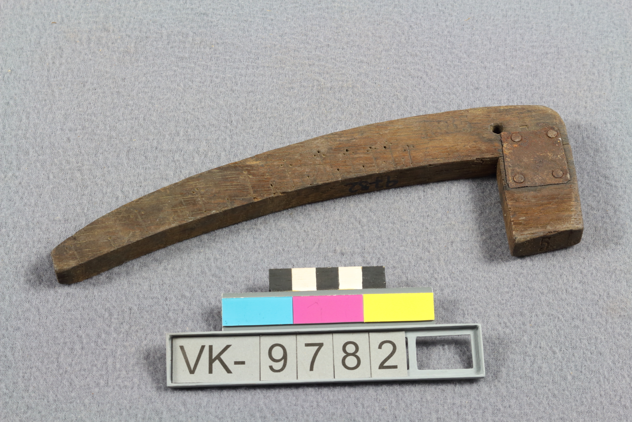 Binderwinkel: Holzbrettchen mit Krümmung, Griffbereich und einer eingeschnittenen Skala. Beschriftungen: "1885", "5".