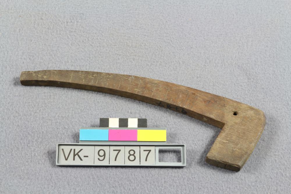 Binderwinkel: Holzbrettchen mit Krümmung, Griffbereich und einer eingeschnittenen Skala. Beschriftung: "1885".