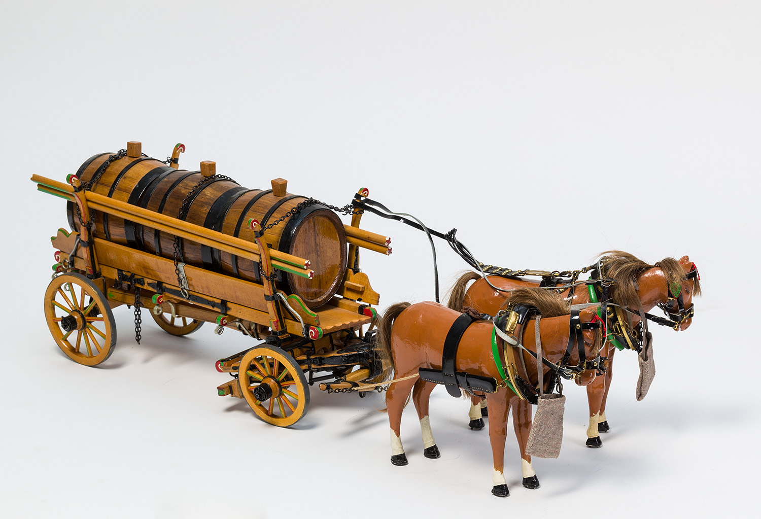 Mostwagen, ca. 1:10: Modell eines Wagens mit drei großen Fässern. Der Wagen ist mit zwei braunen Pferden ausgestattet, die mit komplettem Zuggeschirr dargestellt sind.