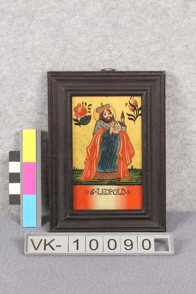 Hinterglasbild mit einer mehrfärbigen Darstellung des Hl. Leopold mit goldenem Hintergrund in einem schwarzen Holzrahmen.