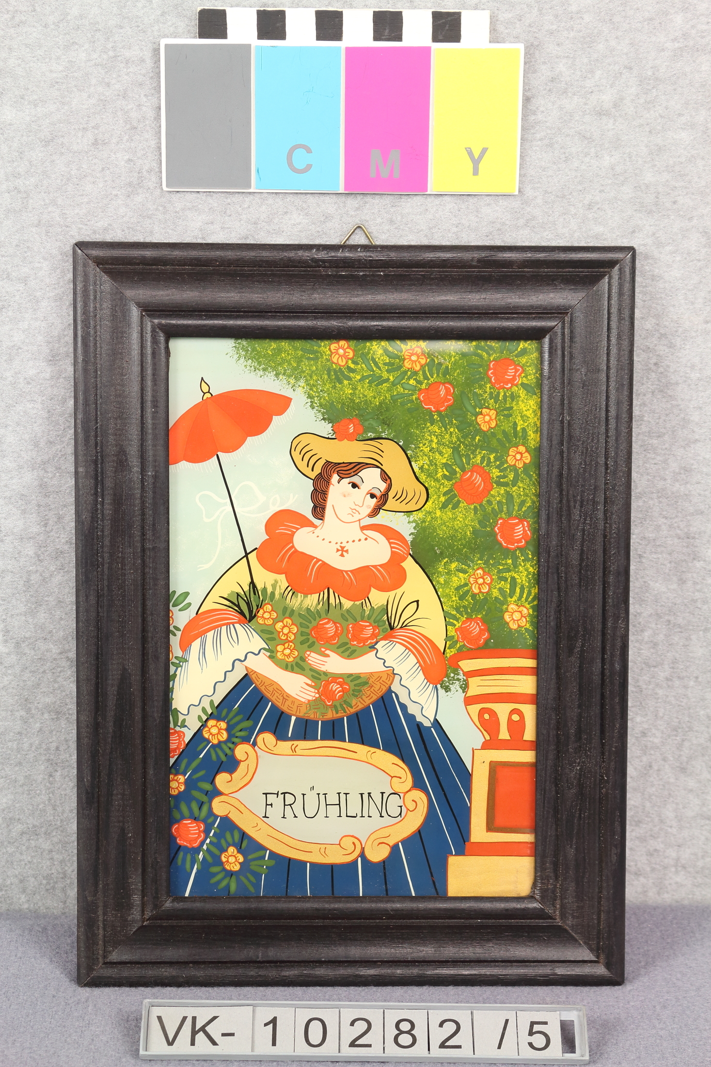Hinterglasbild mit einer mehrfärbigen Darstellung einer Frühlingsallegorie: Frauenfigur in einem Garten mit Blüten. Auf der Rückseite ist ein Stich abgedruckt, darunter ein Verweis auf die Nachfertigung des Bildes. Das Bild wurde in überlieferter Technik nach einem Vorbild gemalt.