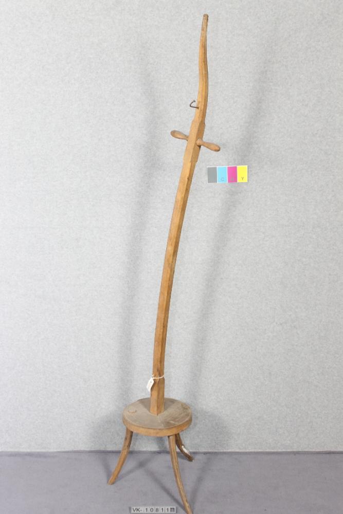 Spinnrocken mit Eisennagel, leicht gebogen mit zwei Griffen, auf einer runden Grundplatte mit drei gebogenen Füßen.