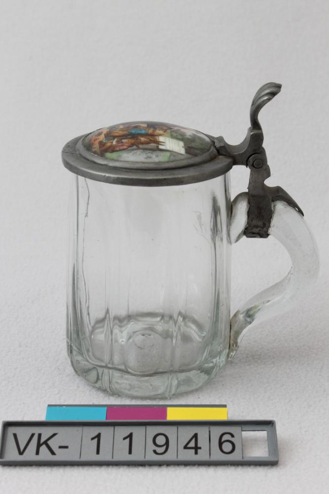 Glaskrügerl mit Zinnmontierung, verziert mit senkrechter Profilierung. Im Zinndeckel ist eine bemalte Porzellanscheibe eingesetzt, das Daumenblatt ist mit einem Palmettenrelief verziert. Auf dem Porzellan ist eine mehrfärbige Bemalung: Tierschule im Freien mit zwei großen Tieren (Fuchs, der Schüler angreift, und Hasenlehrer) und drei Schülern (Hasen). Das Glas hat Eichstrich und Maßzahl "1/4l".