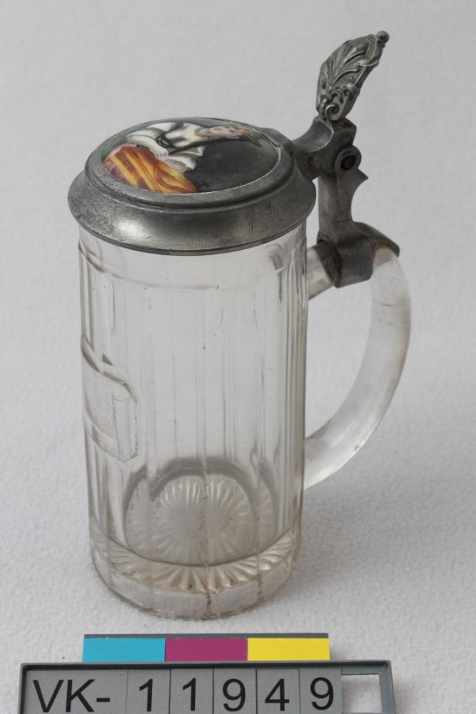Glaskrügerl mit Zinnmontierung, verziert mit senkrechter Profilierung und einem Schild. Im Zinndeckel ist eine bemalte Porzellanscheibe eingesetzt, das Daumenblatt ist mit einem Palmettenrelief verziert. Auf dem Porzellan ist eine mehrfärbige Bemalung: Frau in Tracht, eine Zither spielend.