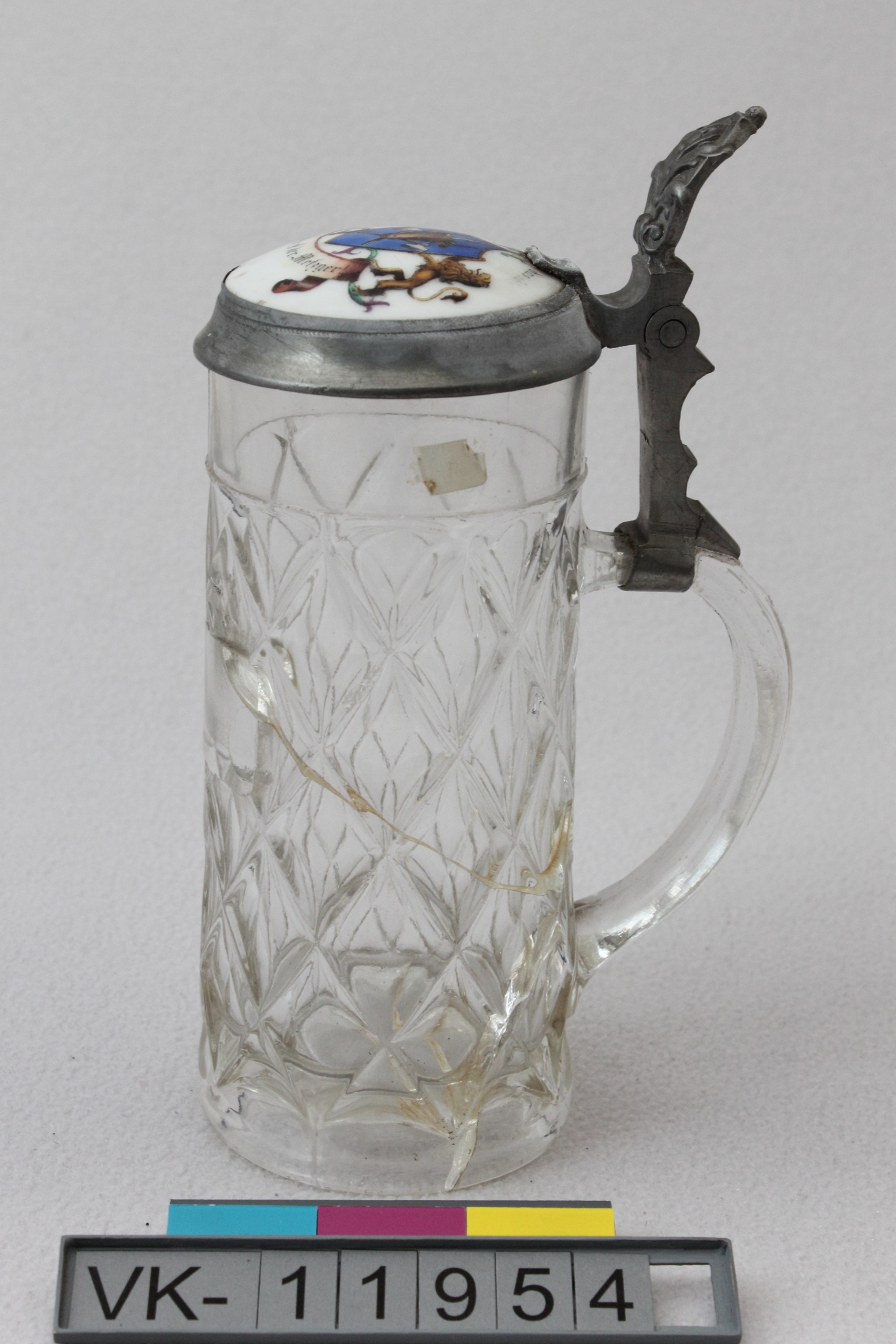 Glaskrügerl mit Zinnmontierung, verziert mit Kreuzschliff. Im Zinndeckel ist eine bemalte Porzellanscheibe eingesetzt, das Daumenblatt ist ornamental verziert. Auf dem Porzellan ist eine mehrfärbige Bemalung: Zwei Löwen halten ein Schild mit Stierkopf und Beilen, dazu Beschriftungen "Hoch lebe das edle" und "Handwerk der Metzger". Das Krügerl hat Maßzahl und Eichstrich "0,5 L".
