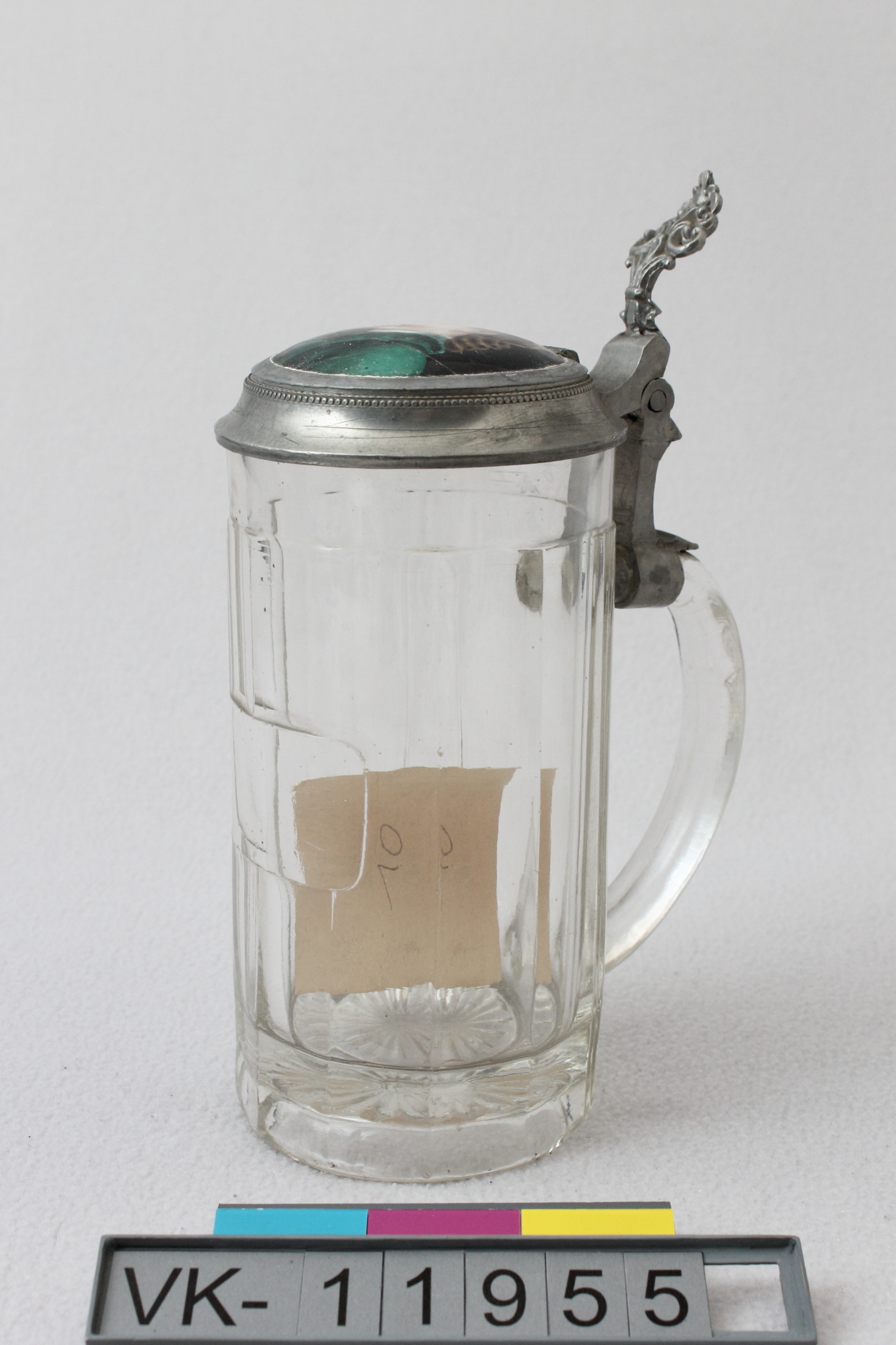 Glaskrügerl mit Zinnmontierung, verziert mit senkrechter Profilierung, vorne ein rechteckiges Feld. Im Zinndeckel ist eine bemalte Porzellanscheibe eingesetzt, das Daumenblatt ist ornamental verziert. Auf dem Porzellan ist eine mehrfärbige Bemalung: Frauenpotrait. Das Krügerl hat Maßzahl und Eichstrich "0,3L".