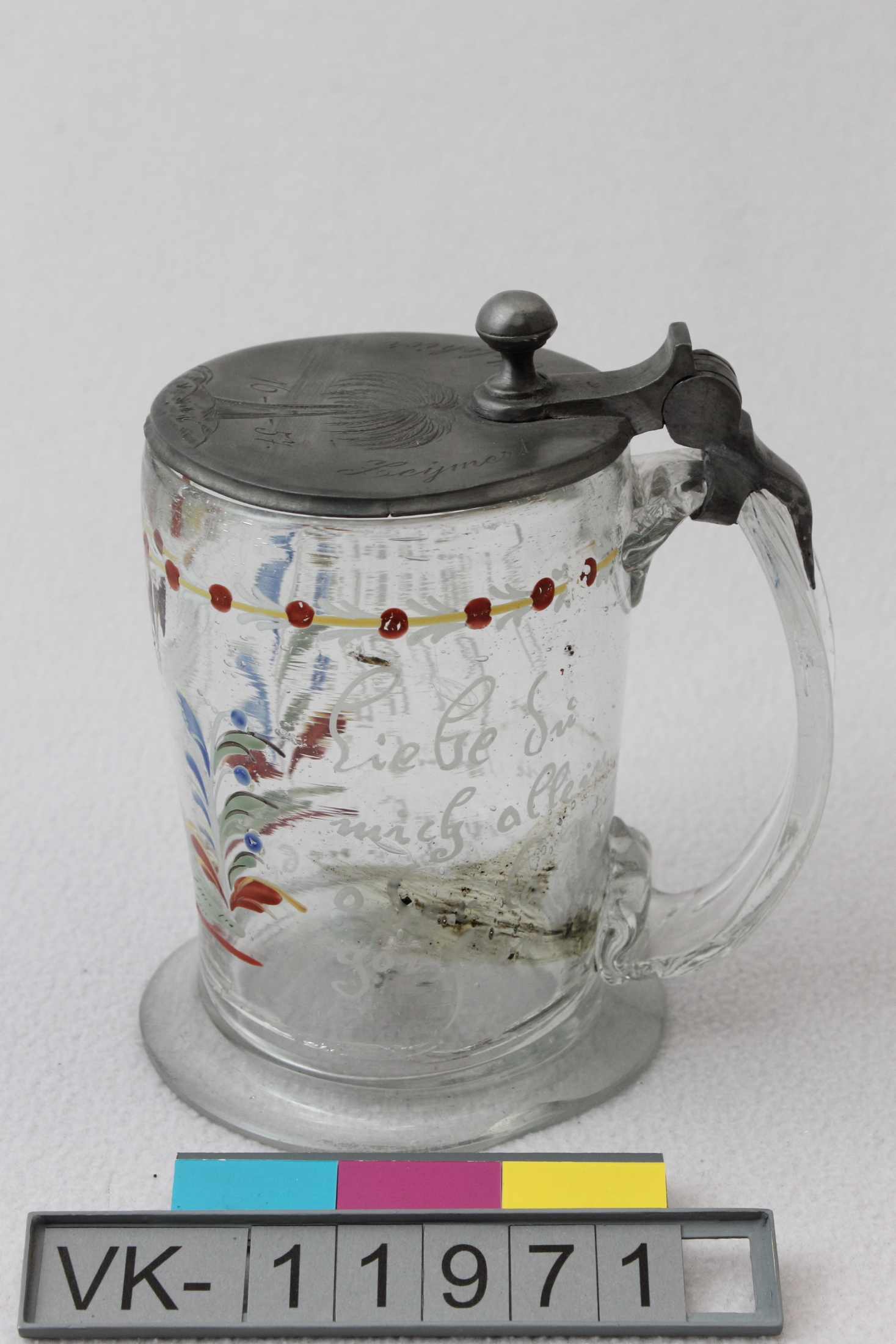 Krügel mit Henkel und Zinnmontierung, klares Glas mit abgesetzter Fußzone und Bemalung und Beschriftung: "Liebe du mich allein oder laß es gar sein" etc. Die Bemalung ist floral, der Zinndeckel ist graviert mit einem Palmenmotiv und einer weiteren Beschriftung: "Melchior Zeymert", "1657".