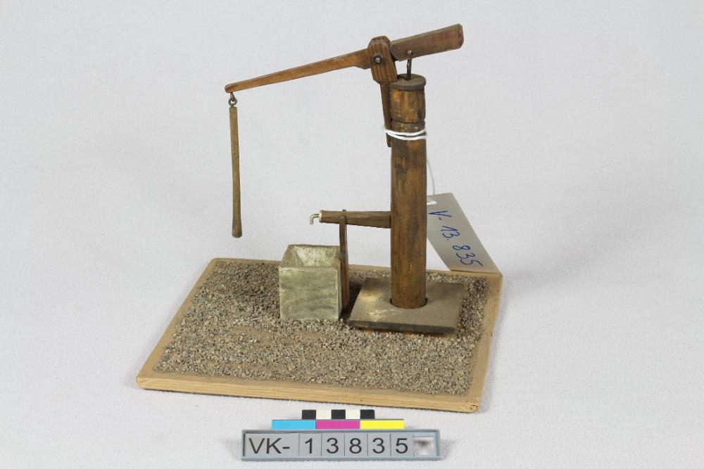 Modell eines Schöpfbrunnens mit Hebel und einem aus Gips hergestellten Steinbecken auf einer Schotterunterage.