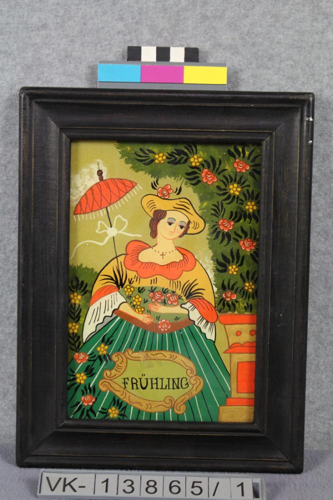 Hinterglasbild in einem schwarzen profilierten Holzrahmen, dargestellt ist eine Frau in Tracht mit Blumen, Bildunterschrift: "FRÜHLING". Auf der Rückseite ist ein Aufdruck mit Blumenmotiv und Textband: "ORIGINAL HANDGEMALTES HINTERGLASBILD" sowie ein Aufkleber des NÖ Heimatwerks.
