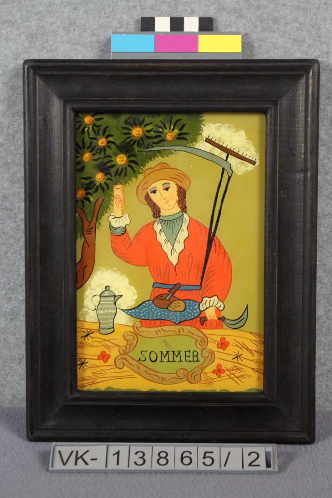Hinterglasbild in einem schwarzen profilierten Holzrahmen, dargestellt ist ein Bauer mit Geräten und einer Jause, Bildunterschrift: "SOMMER". Auf der Rückseite ist ein Aufdruck mit Blumenmotiv und Textband: "ORIGINAL HANDGEMALTES HINTERGLASBILD" sowie ein Aufkleber des NÖ Heimatwerks.