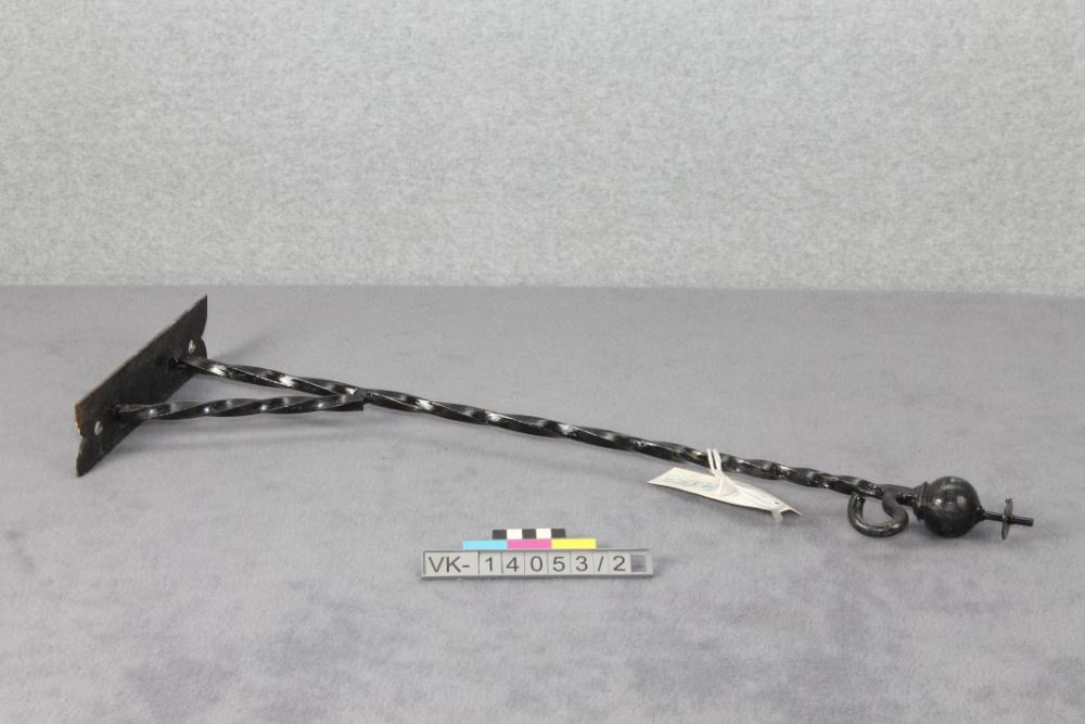 Schwarz lackierte Aufhänung zur Wandmontage mit Montageplatte, einem abgestützten Ausleger aus gedrehtem Vierkanteisen und einer Eisenkugel mit einem Haken an der Spitze.