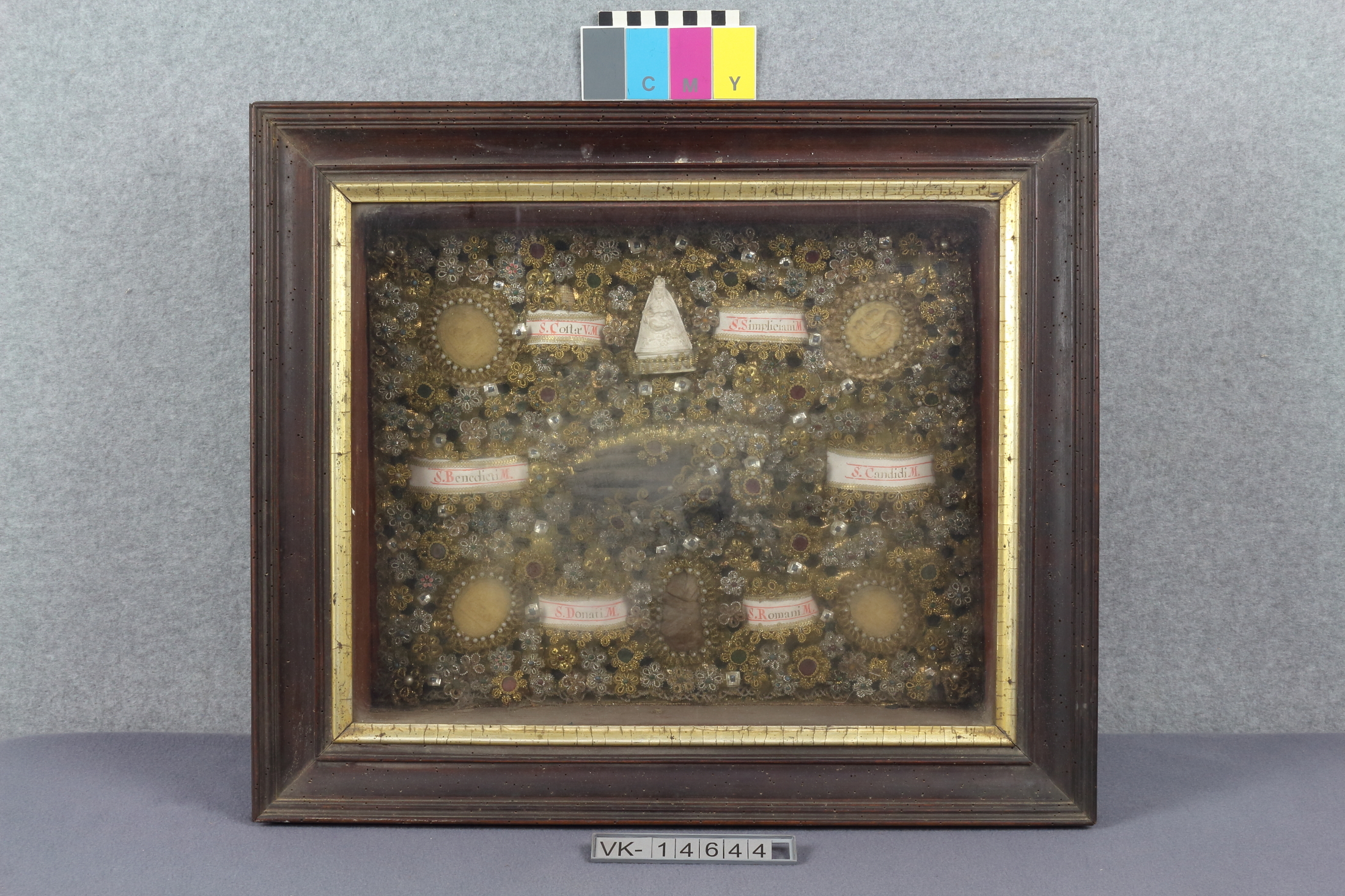 Klosterarbeit mit vier Wachsmedaillons, Glasperlen und Bouillonzier aus Gold- und Silberdraht. In der Mitte ist eine Annahand, darüber ein Gnadenbild.