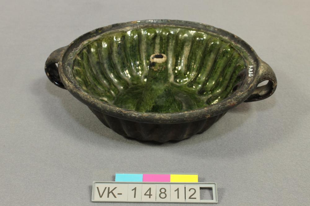 Innen dunkelgrün glasierte, niedrige Gugelhupfform mit zwei Henkeln.