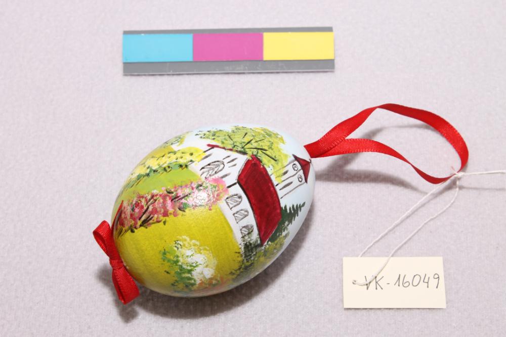 Osterei (ausgeblasenes Gänseei), bemalt mit einem Landschaftsmotiv mit Kirche. Das Ei hat ein rotes Bändchen zum Aufhängen.