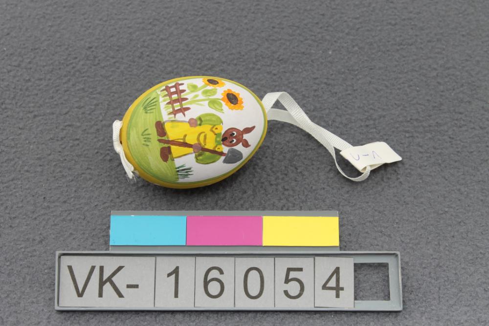 Hühnerei, großteils gelb bemalt mit einem Motiv auf einer Seite: Hasenfigur mit Schaufel und Sonnenblumen. Das Ei hat ein weißes Ripsbändchen.