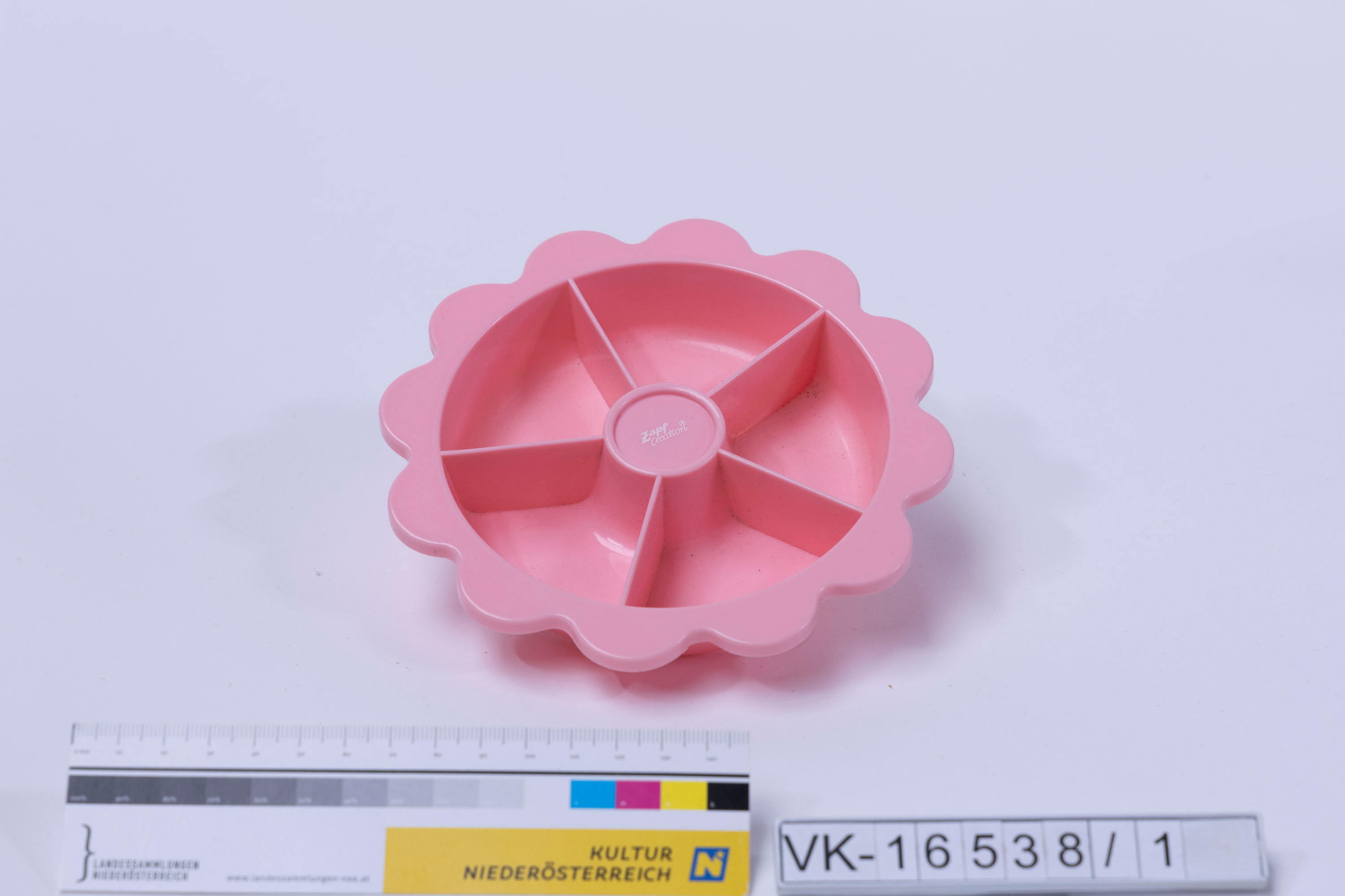Tiefer rosa Kunststoffteller mit gewelltem Rand und Unterteilung in fünf Einzelbereiche. In der Mitte ein weißer Aufdruck: "Zapf Creation". Das Objekt befindet sich auf dem Restaurierungstisch.