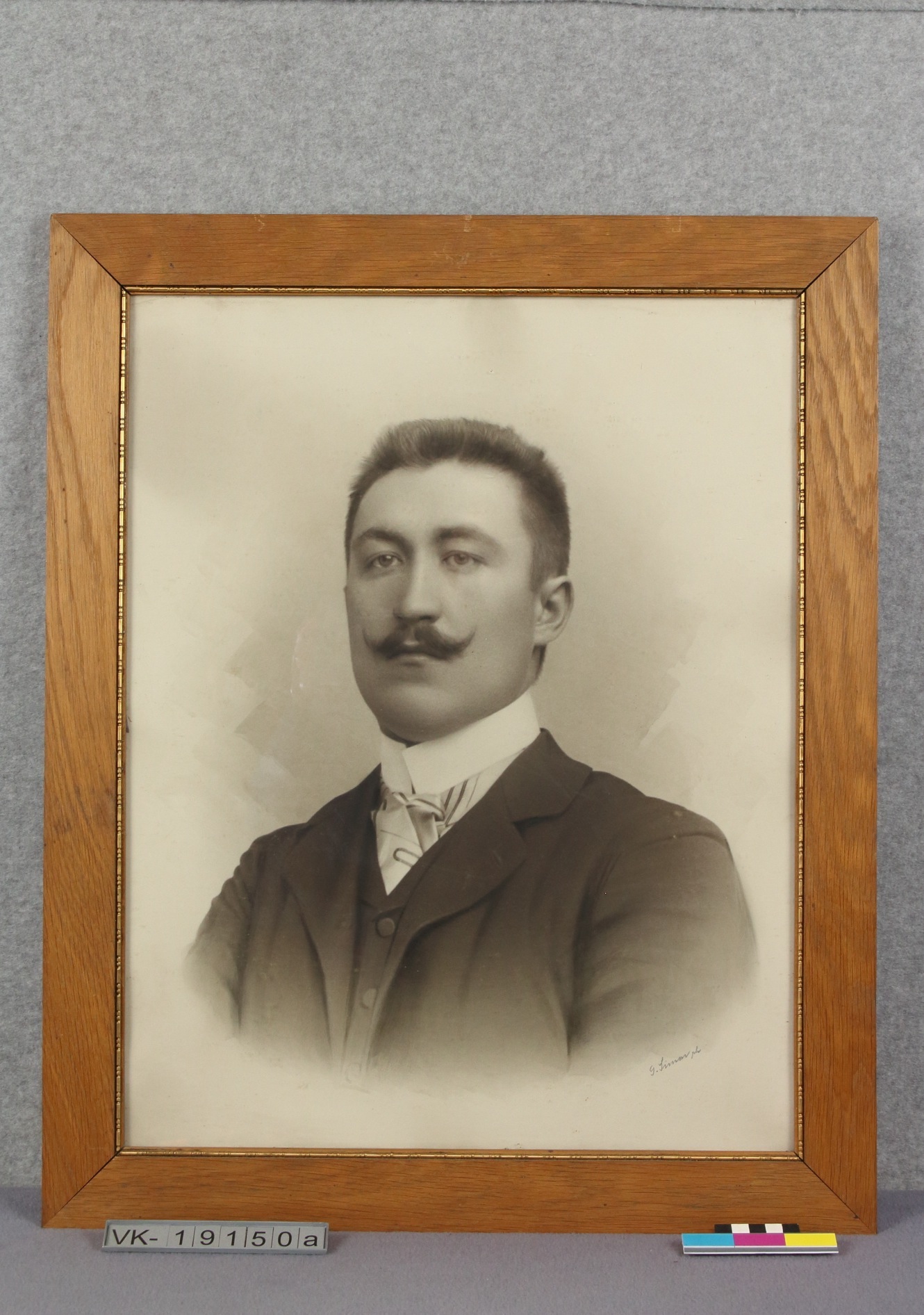 Portraitfoto eines Mannes in einem teilweise vergoldeten hellen Holzrahmen hinter Glas, auf der Rückseite ist ein Etikett: "Photographisch-artistisches Atelier Gustav Simon St. Pölten Parkpromenade 20".