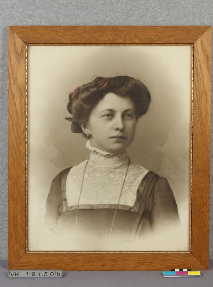 Portraitfoto einer Frau in einem teilweise vergoldeten hellen Holzrahmen hinter Glas, auf der Rückseite ist ein Etikett: "Photographisch-artistisches Atelier Gustav Simon St. Pölten Parkpromenade 20".