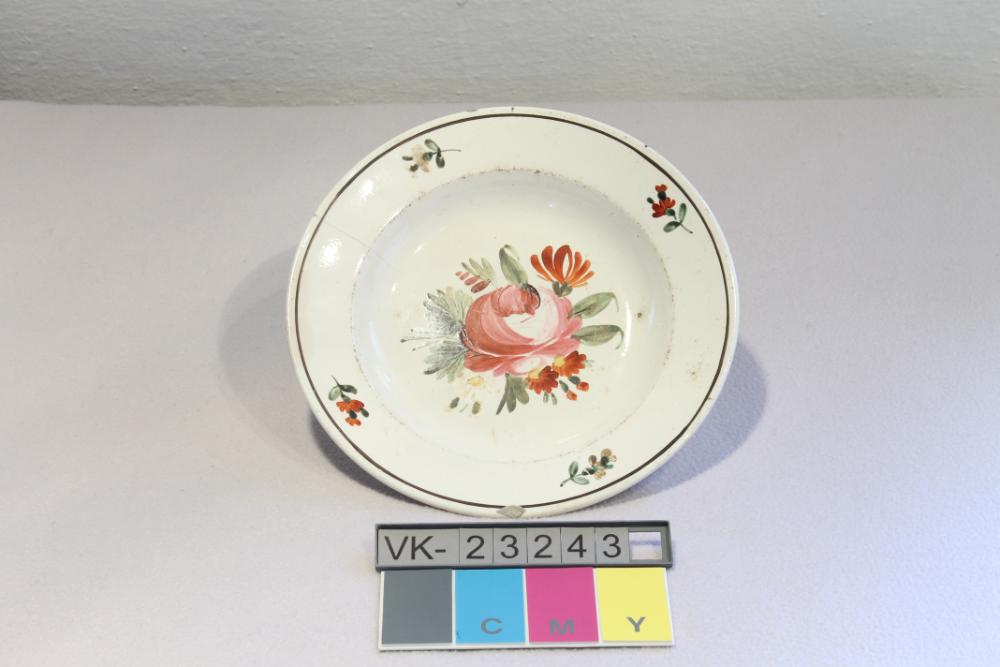 Weißer flacher Teller mit einem großen Blütenmotiv auf dem Spiegel und vier kleinen Blütenelementen auf der Fahne. Auf dem Boden hat der Teller eine Pressmarke.