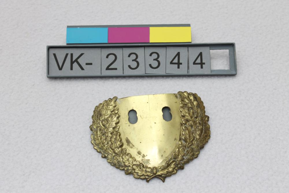 Teil eines Abzeichens: Eichenlaubkranz mit wappenschildförmiger Aussparung und zwei Löchern (vermutlich Feuerwehr).