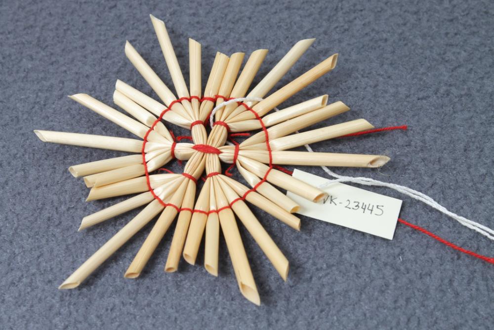 Strohstern, mit rotem Garn gebunden und einem Aufhängebändchen. Der Stern ist sechsstrahlig, wobei jeder Strahl fünffach aufgefächert ist. Die Sterne VK-23445 bis VK-23449 sind sehr ähnlich.