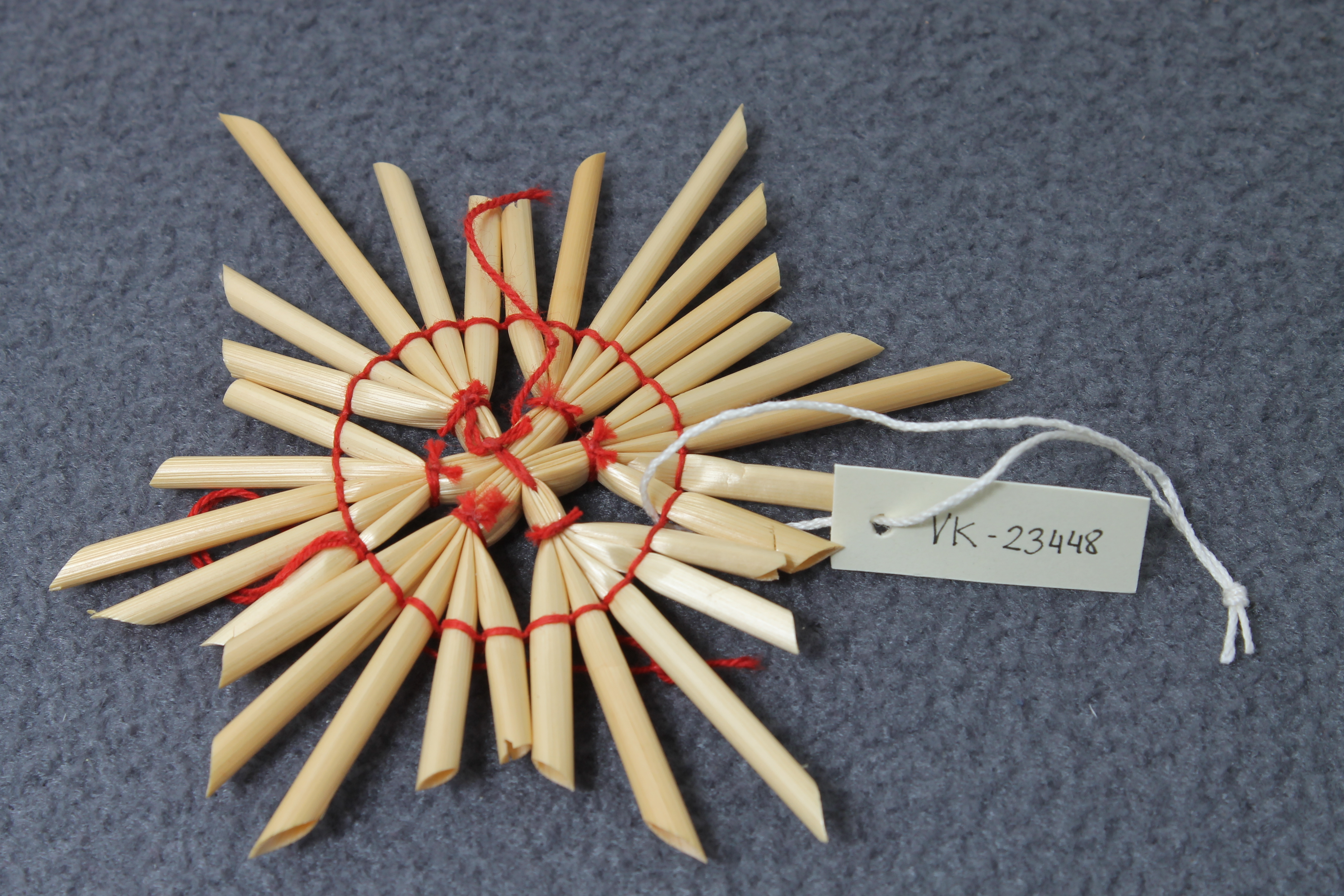 Strohstern, mit rotem Garn gebunden und einem Aufhängebändchen. Der Stern ist sechsstrahlig, wobei jeder Strahl fünffach aufgefächert ist. Die Sterne VK-23445 bis VK-23449 sind sehr ähnlich.