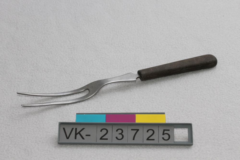 Grill- oder Vorlegegabel, zweizinkig mit Bakelitgriff.