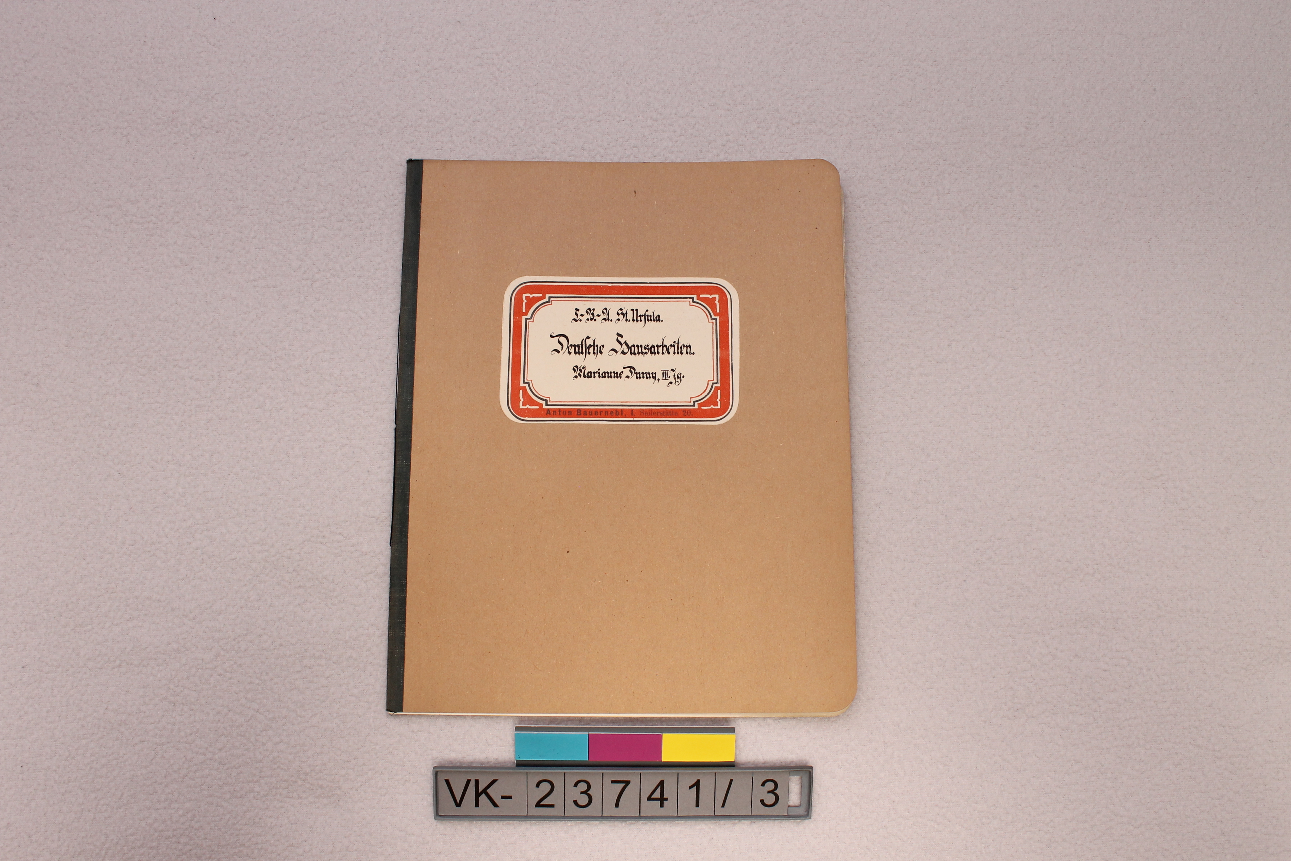 Schulheft (VK-23741_3a) mit braunem Einband und schwarzem Rücken, liniert. Das Heft hat ein Etikett mit Herstellerangabe: "Anton Bauernebl, I. Seilerstätte 20." und Beschriftung: "L.-B.-A. St. Ursula Deutsche Hausarbeiten Marianne Duray III. Jg.". Dazu ein eingelegtes Löschblatt (VK-23741_3b).