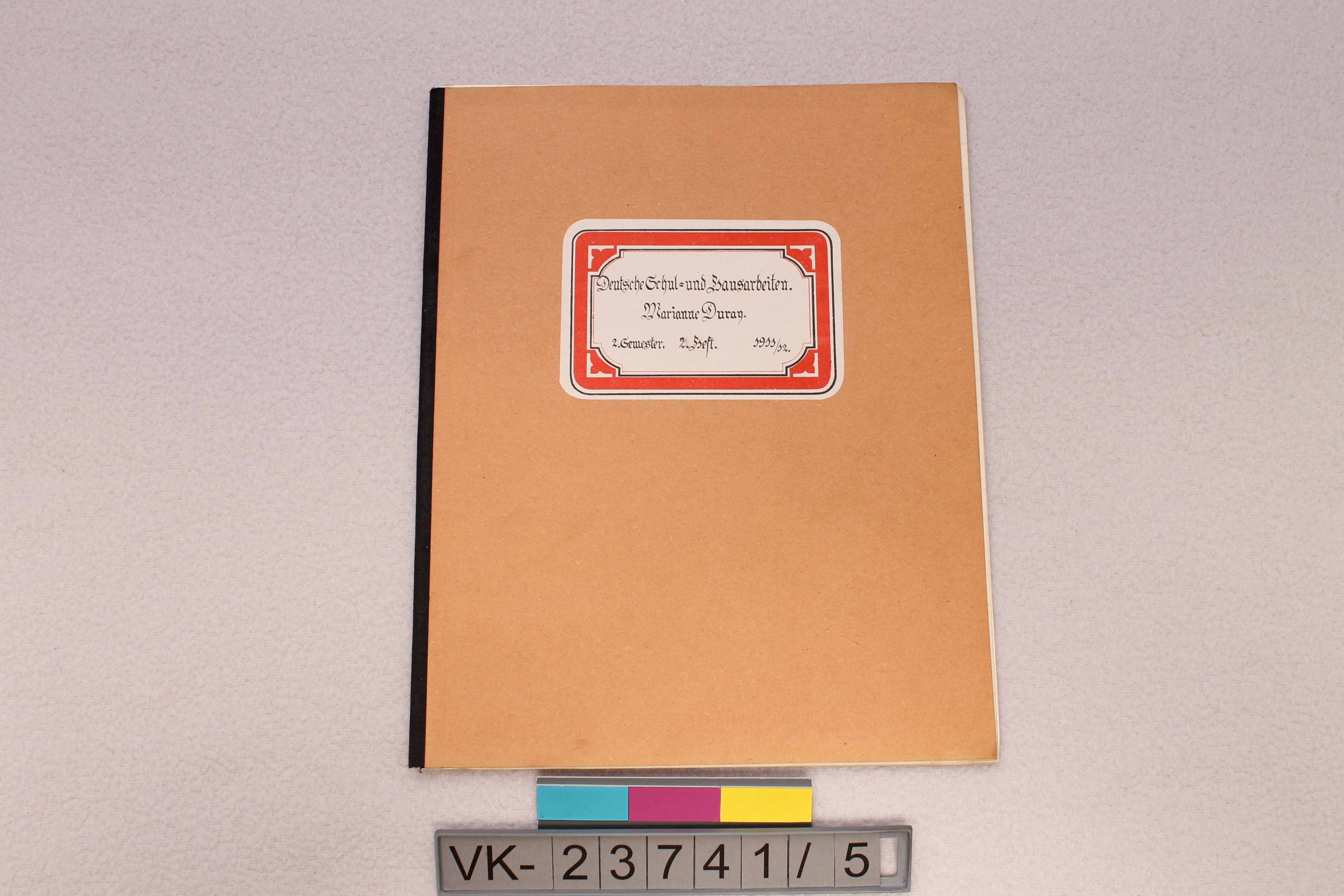 Schulheft (VK-23741_5a) mit braunem Einband und schwarzem Rücken, liniert. Das Heft hat ein Etikett mit Beschriftung: "Deutsche Schul- und Hausarbeiten Marianne Duray 2. Semester 2. Heft 1911/12 ". Dazu ein eingelegte Löschblätt (VK-23741_5b und VK-23741_5c).
