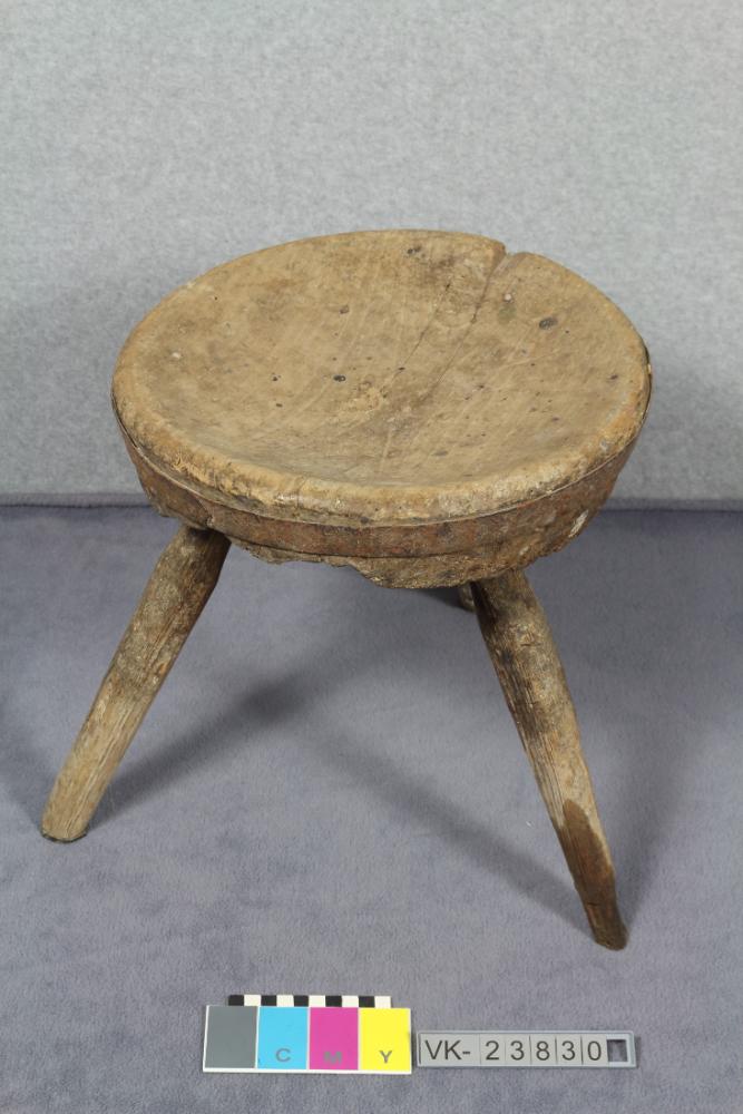 Dreifüßiger Melkschemel mit Eisenring.