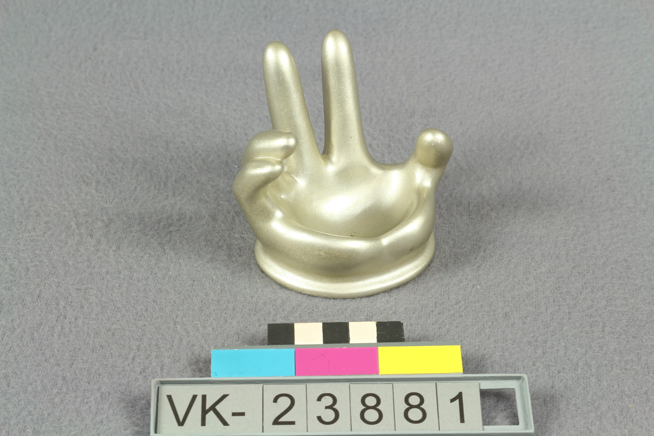 Schmuckablage in Form einer silbern lackierten, stilisierten, offenen Hand mit zwei hochgestreckten Fingern (für Ringe).