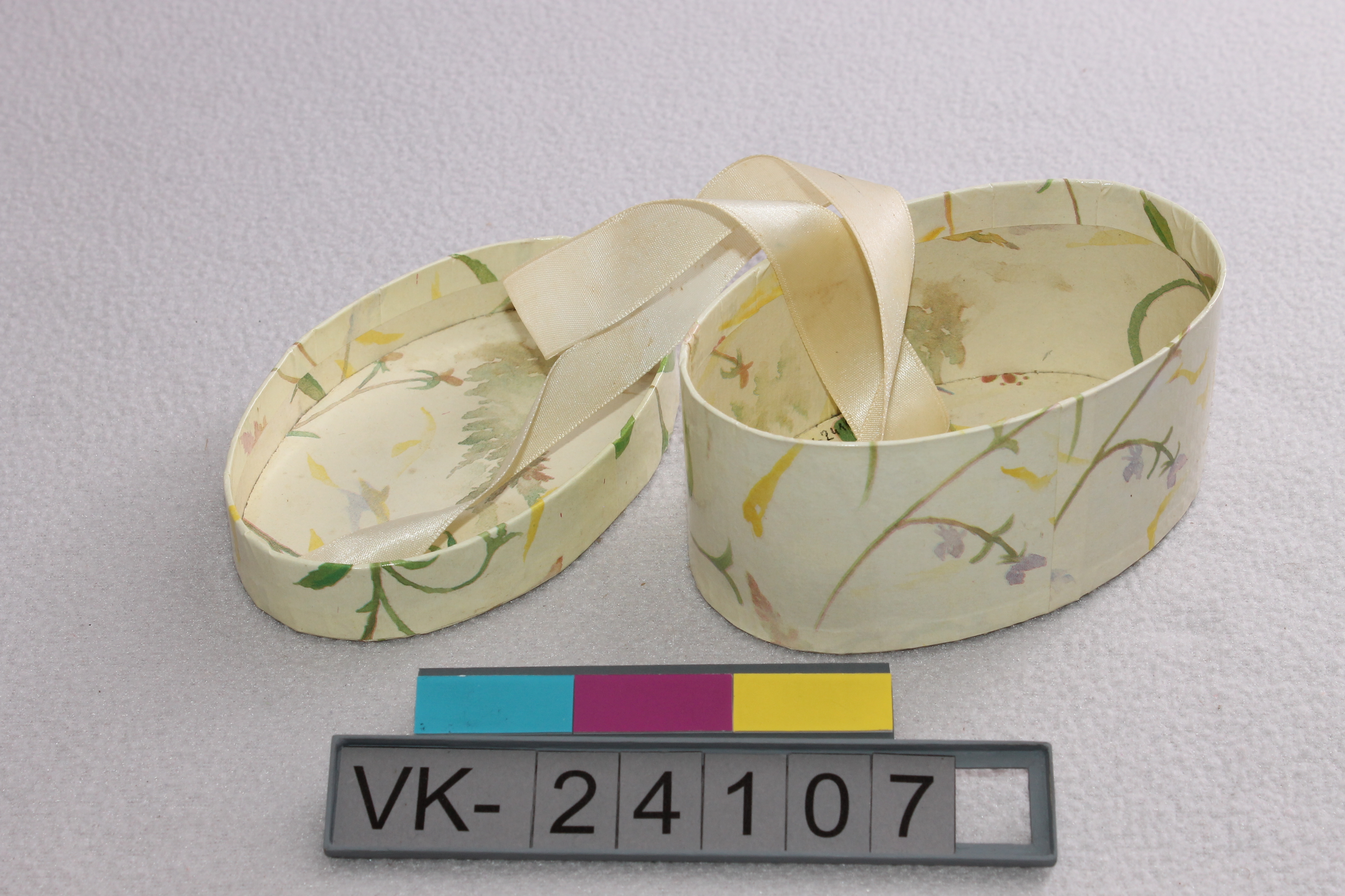 Ovale Schachtel aus Karton (VK-24107a) mit Deckel (VK-24107b), bezogen mit geblümtem Papier; in der Schachtel sind beige Ripsbänder.