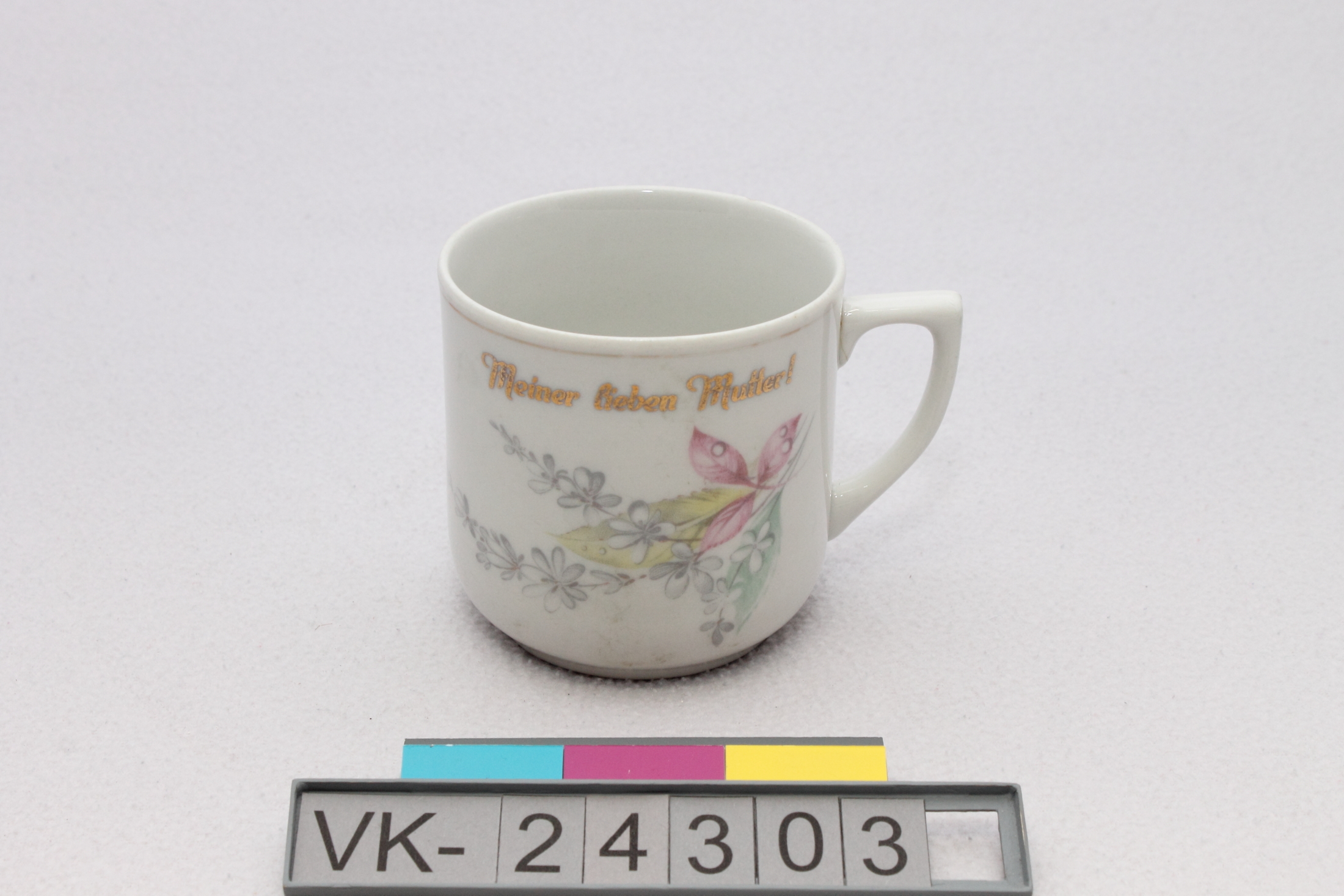 Weißes Häferl mit eckigem Henkel, Blumenmotiv und goldener Beschriftung: "Meiner lieben Mutter!". Auf dem Boden befindet sich eine Herstellermarke: "WILHELMSBURGER PORZELLAN AUSTRIA".