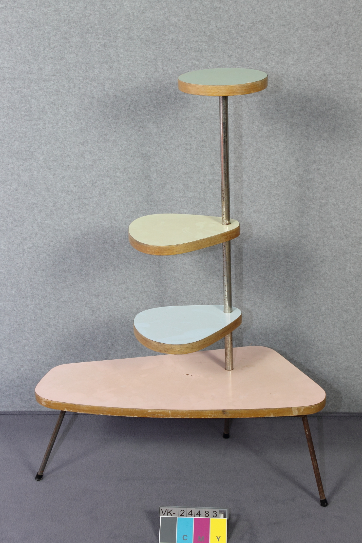 Blumentischchen oder Regal mit vier Ebenen, die unterschiedliche geformt sind und aus farblich unterschiedlich beschichteten Pressspanplatten bestehen (rosa, blau, zwei Grüntöne). Das Tischchen hat drei Metallfüße.