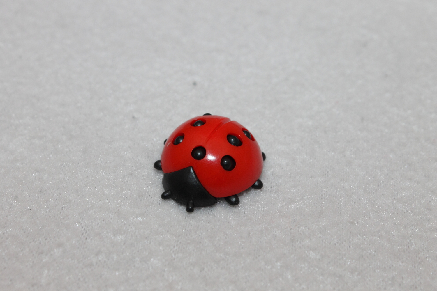Glücksbringer: Marienkäfer aus schwarzem und rotem Kunststoff, an der Unterseite ist ein runder Magnet verklebt.