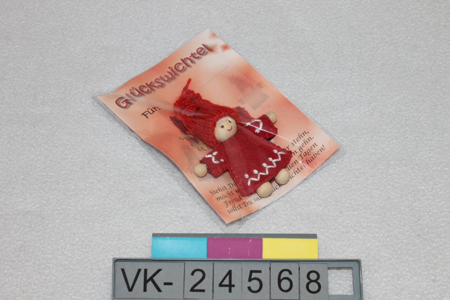 Glücksbringer, originalverpackt: Kleine Figur aus Holz mit roter Filzkleidung und einer Wollmütze auf einem Karton in Folie; Beschriftung "Glückswichtel für" mit einer Zeile zum Eintragen eines Namens. Auf der Rückseite Angaben zum Importeur.