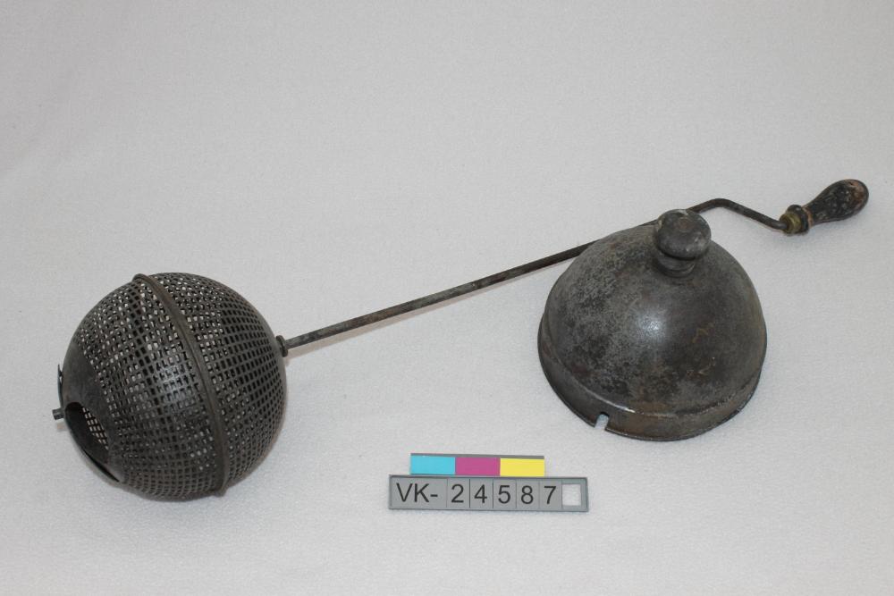 Kugelförmig vergitterter Kaffeeröstereinsatz (VK-24587a) und halbkugeliger Deckel (VK-24587b) mit Knauf, beschriftet: "PATENT FLEISCHMANN MÖDLING & WIEN".