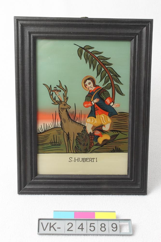 Hinterglasbild in einem schwarzen Holzrahmen, auf der Rückseite mit bedrucktem Papier beklebt ("Dieses Hinterglasbild wurde nach alten Vorbildern in der überlieferten Technik handgemalt"). Darstellung des Hl. Hubertus mit Hirsch, Bildunterschrift "S. HUBERTI".