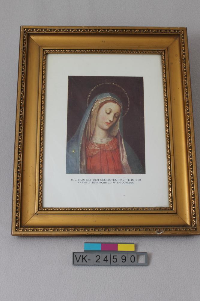 Marienbild in einem vergoldeten Holzrahmen hinter Glas; Bildunterschrift "U. L. FRAU MIT DEM GENEIGTEN HAUPTE IN DER KARMELITERKIRCHE ZU WIEN-DÖBLING".
