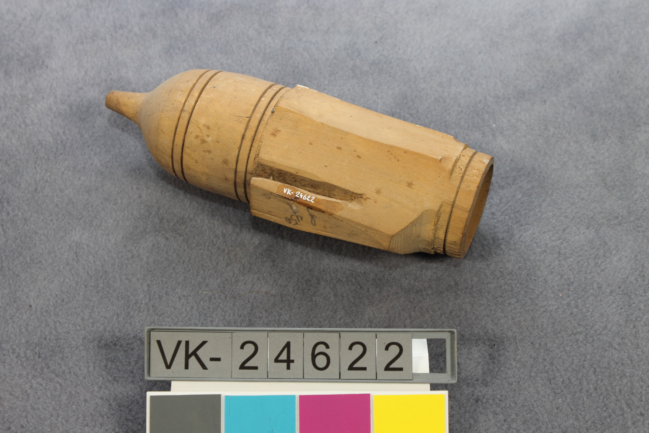 Holzkumpf, im oberen Bereich kantig profiliert, mit eingearbeiteter Gürtelklammer und einem Konus an der Unterseite.