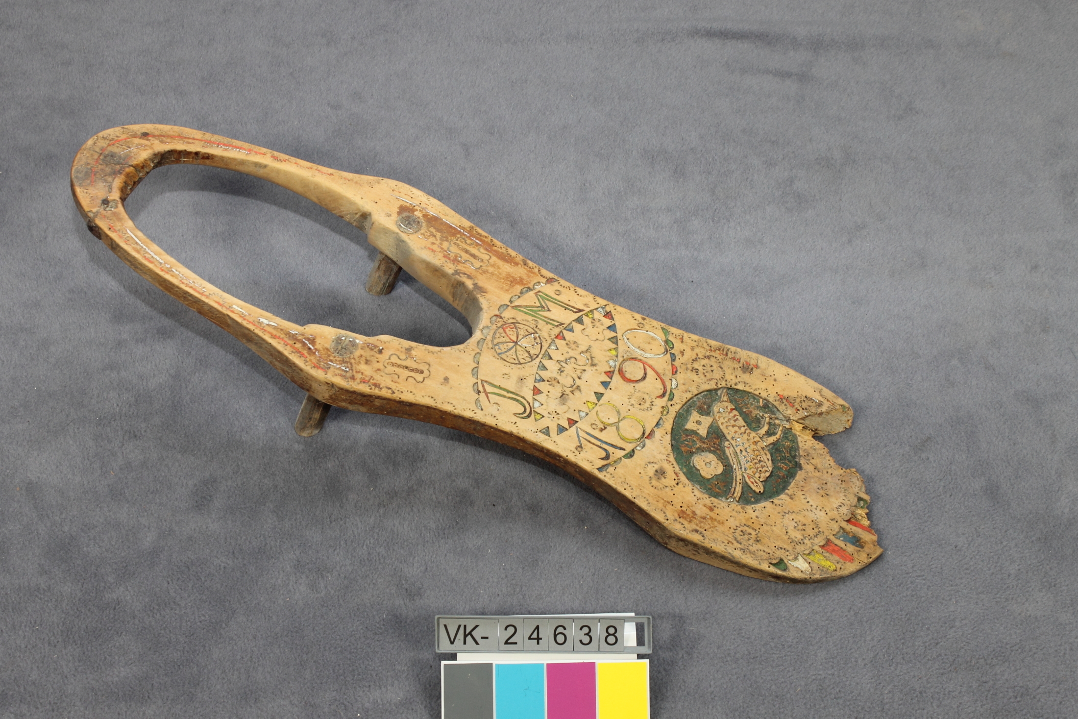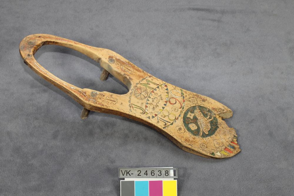 Stiefelknecht aus einem Holzbrett mit annähernd ovaler Öffnung und zwei Füßen; der Stiefelknecht ist an der Oberseite mit verschiedenen Schnitz- und Schlagverzierungen gestaltet, die farblich ausgefüllt sind. U. a. ist ein Vogelmotiv dargestellt, dazu Initialen "JM" und eine Datierung "1890".