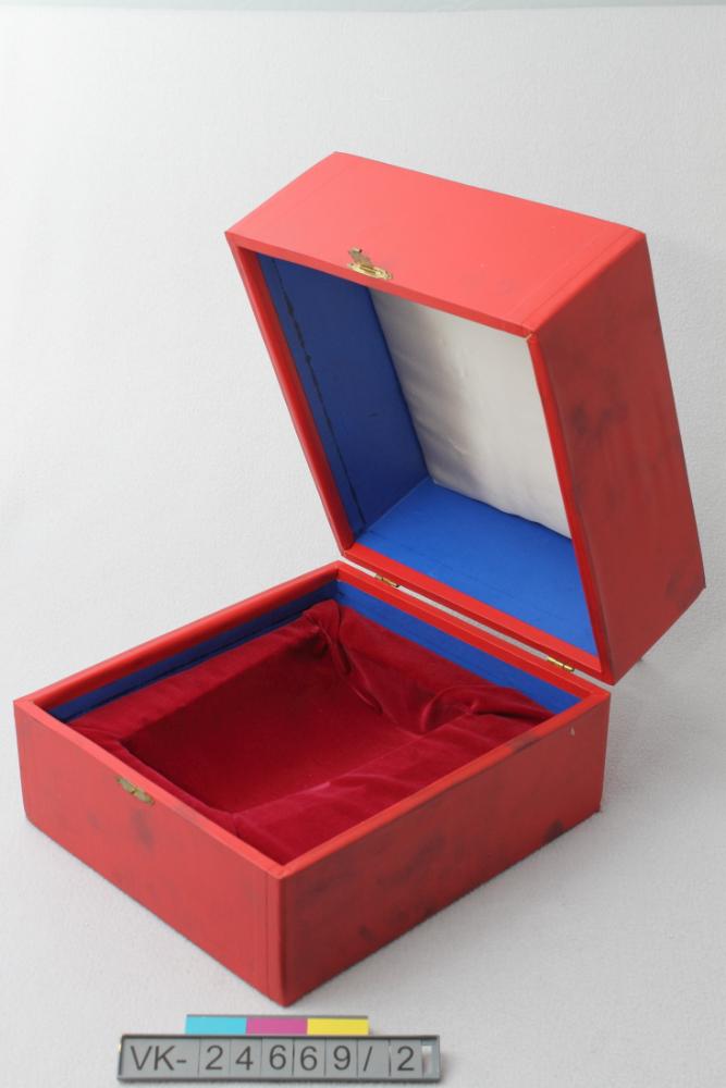 Rechteckige Schachtel mit Klappdeckel und Messingbeschlägen, innen mit rotem Samt bezogen. Die Schachtel hat innen eine Vertiefung zum Einlegen der Kanne, sie ist außen mit einer roten selbstklebenden Folie bezogen.