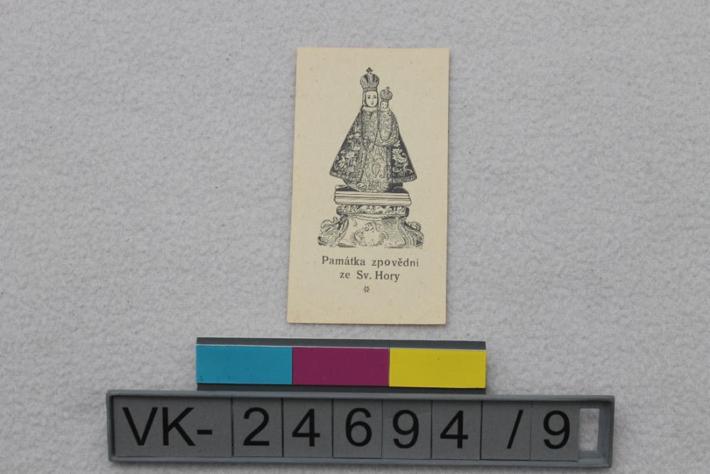 Andachtsbildchen mit Gnadenbild (Svata Hora, Kloster Heiliger Berg); auf der Rückseite ein Gebet in tschechischer Sprache.
