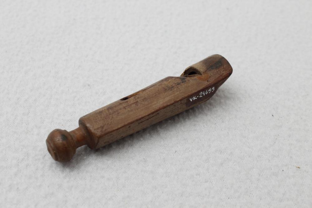 Kleine Holzpfeife (möglicherweise für die Jagd) mit einem runden Halteknauf.