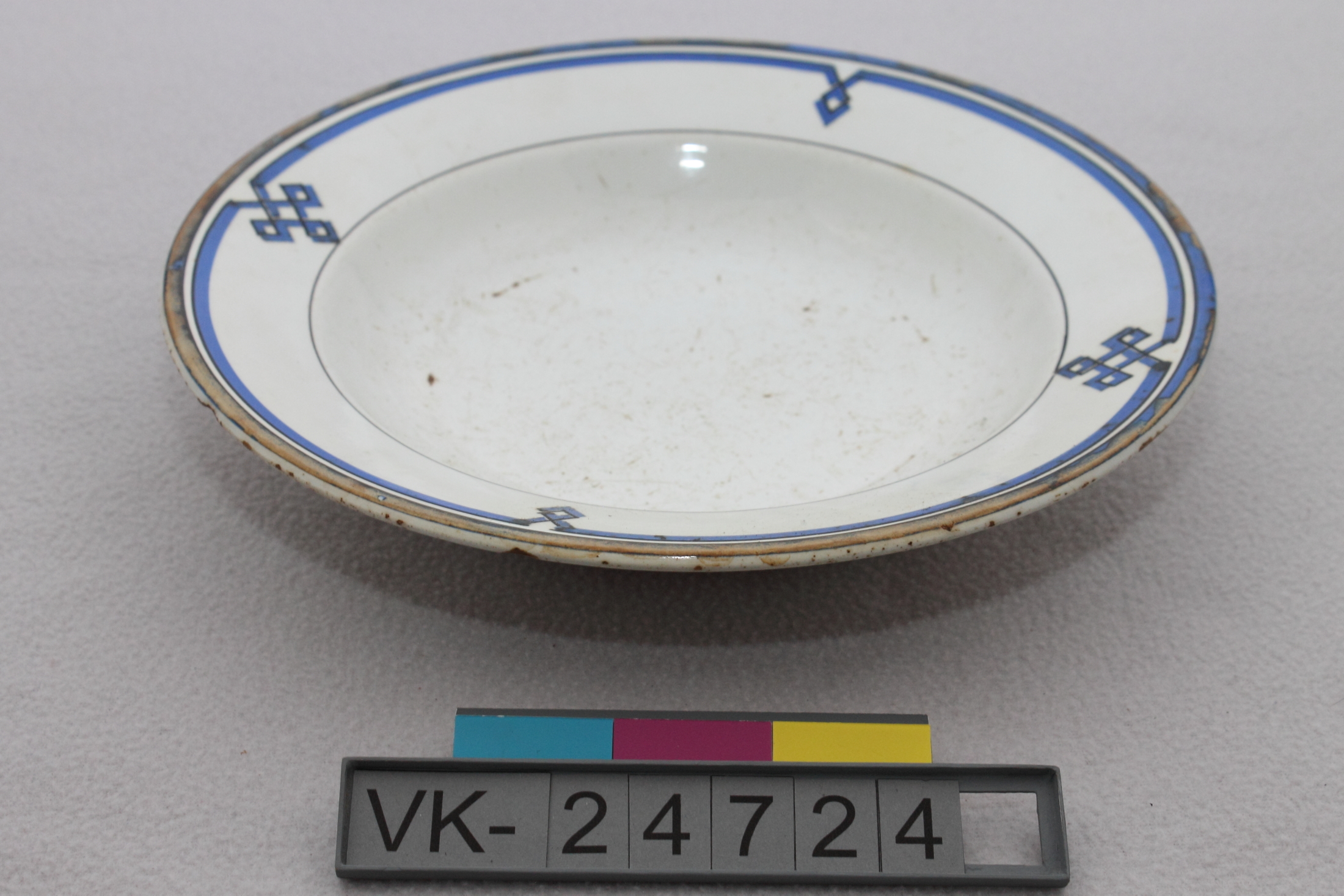 Flacher weißter Teller mit Standring und Dekor auf der Fahne: Blau-schwarze Zierlinien. Auf dem Boden ein Markenzeichen: "OPAQUE WILHELMSBURG".